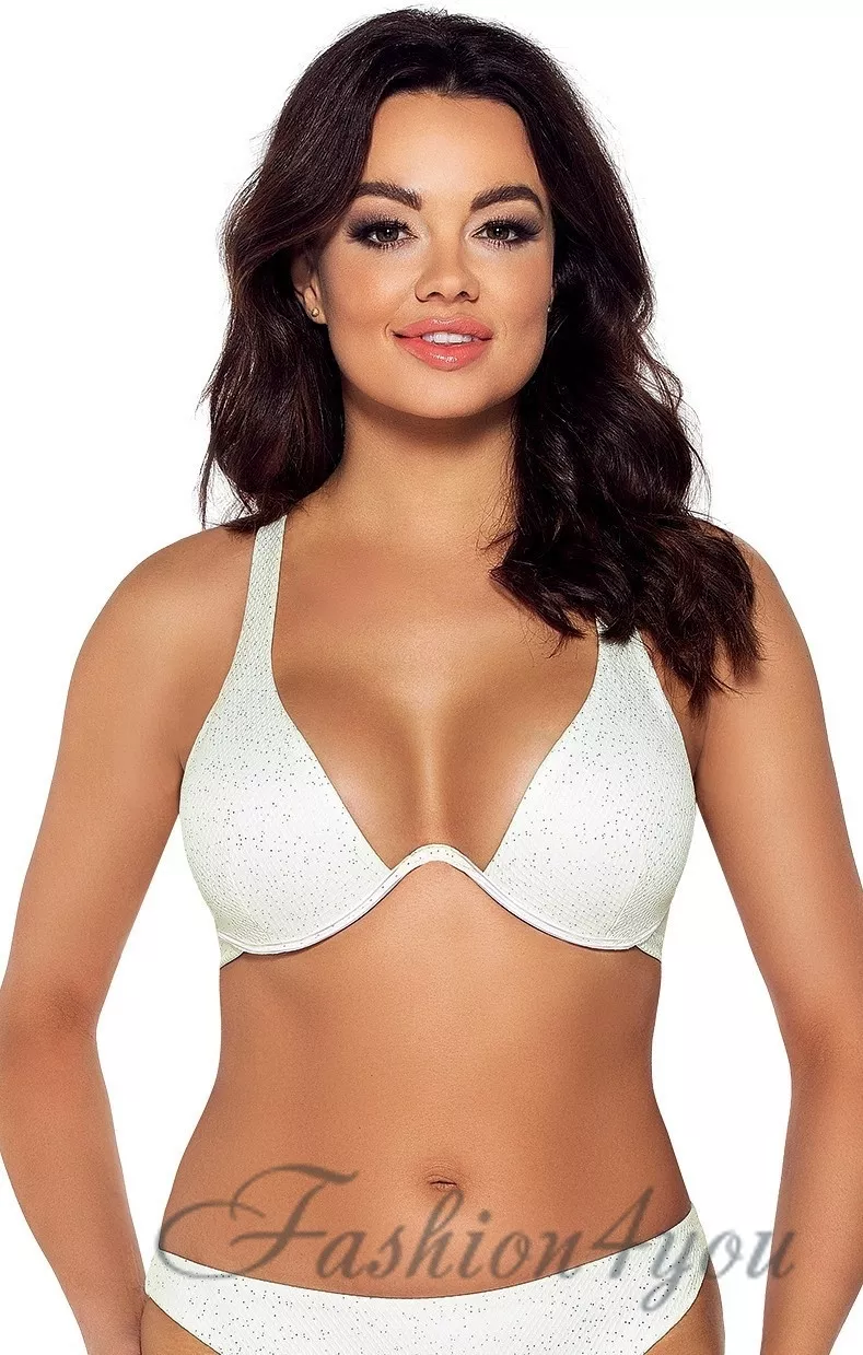 Сміливий та сексуальний роздільний купальник Ava SK 162. Кремова тканина з неоднорідною текстурою красиво виглядає на тілі, підкреслюючи загар блискучим золотистим конфетті. М'які чашечки на кісточках делікатно піднімають і підтримують груди, чуттєво підкреслюючи декольте. Еластична зав'язка тримає бюстгальтер на потрібному місці, а знімні (тільки позаду) бретелі дозволяють перехрестити їх на спині.