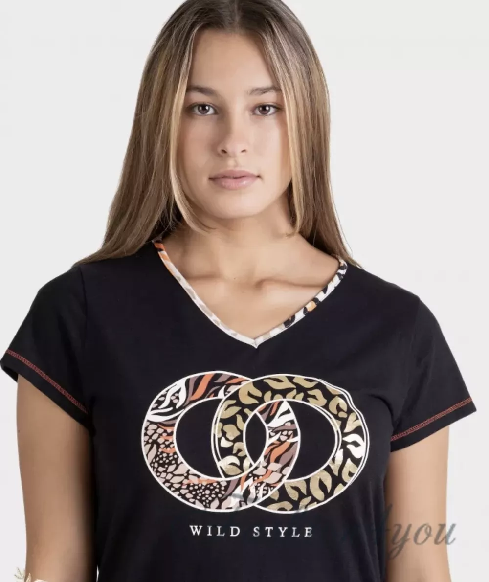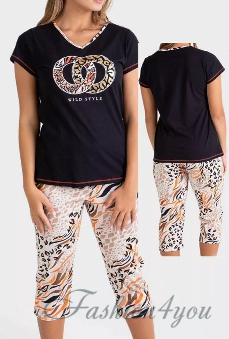 Элегантная женская пижама Massana P231244, изготовленная из натурального хлопка, предлагает уют и стиль для вашего комфортного отдыха. Комплект включает в себя футболку с коротким рукавом, V-образный вырез которой украшен ярким кантом, и бриджи прямого кроя с оригинальным животным принтом. Погрузитесь в мягкость и элегантность с этой изысканной пижамой.