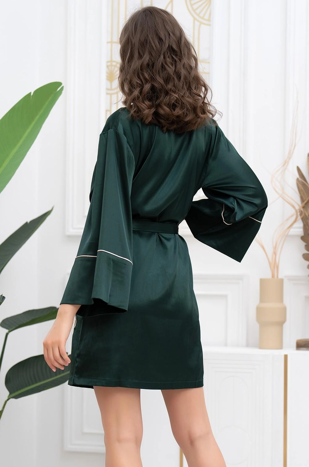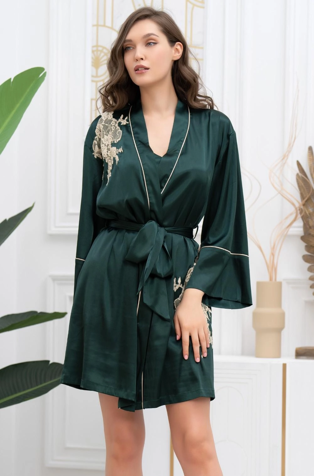 Короткий халат на запаз Феллини 3913 от Mia-Amore с длинными рукавами выполнен из смесового шёлка. Спереди верхняя часть и противоположная пола халата украшены кружевными вставками. Планка и широкие манжеты халата декорированы контрастными кантами.