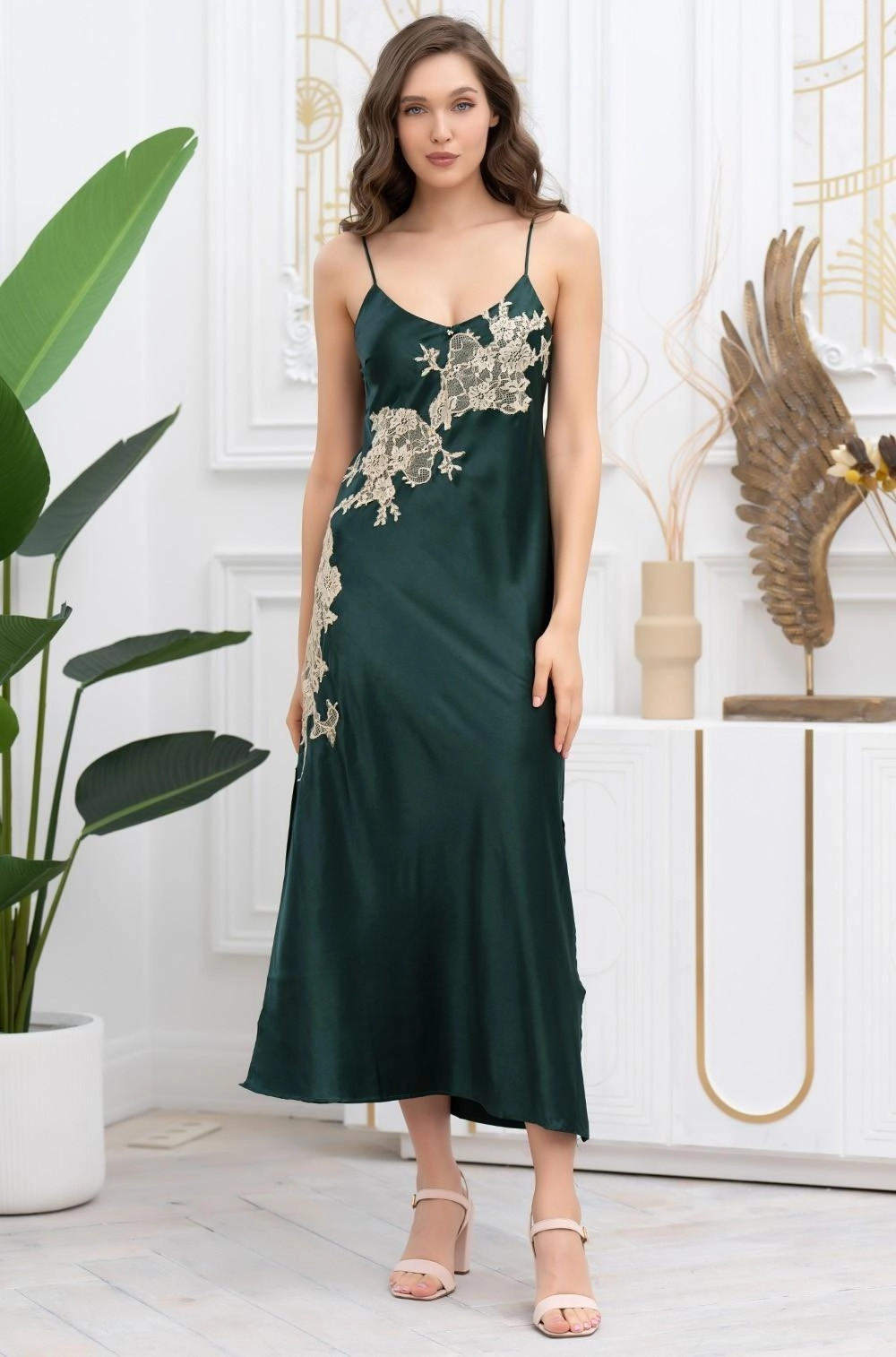 Длинная сорочка Феллини 3918 от Mia-Amore на тонких бретелях выполнена из смесового шёлка. Передняя часть сорочки украшена кружевными вставками, рассыпанными по шёлку ажурными бутонами. Сбоку сорочки эффектный разрез.