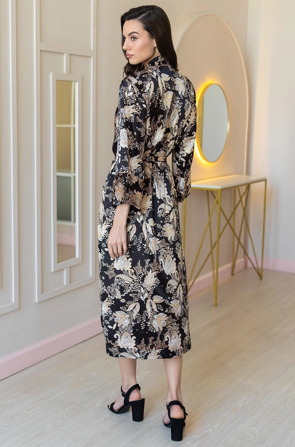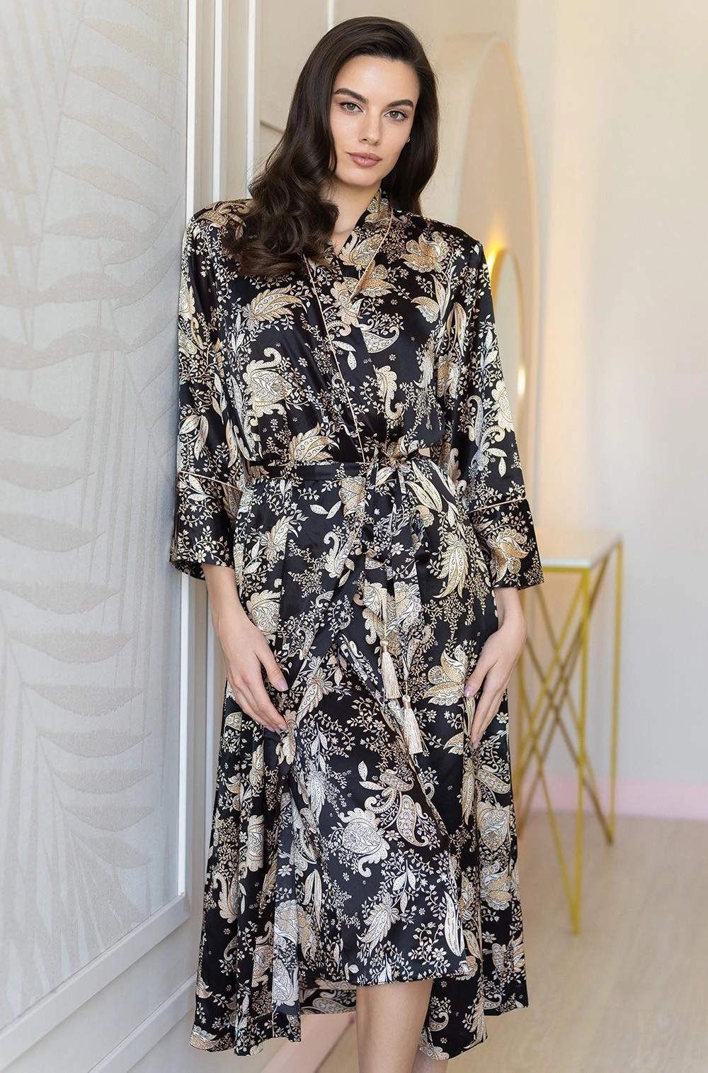Длинный запашной халат Ясмина 3989 Mia-Amore выполнен из принтованного смесового шёлка. Низ рукавов, ланка халата отделана золотым кантом. Халат запахивается на пояс с золотыми декоративными кисточками, в боковых швах есть карманы.