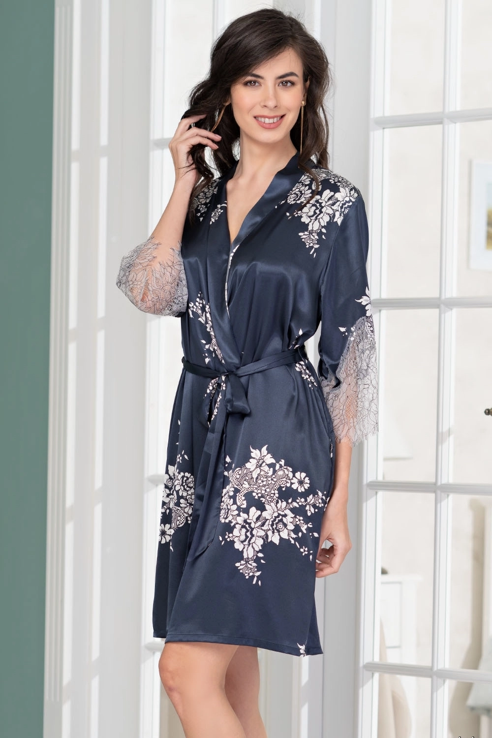 Короткий халат Александрия 3573 от Mia-Amore с рукавами длиной 3/4 выполнен из принтованного смесового полотна. Низ рукавов декорирован изысканным широким вырезным кружевом. Халат запахивается на пояс, в боковых швах карманы.