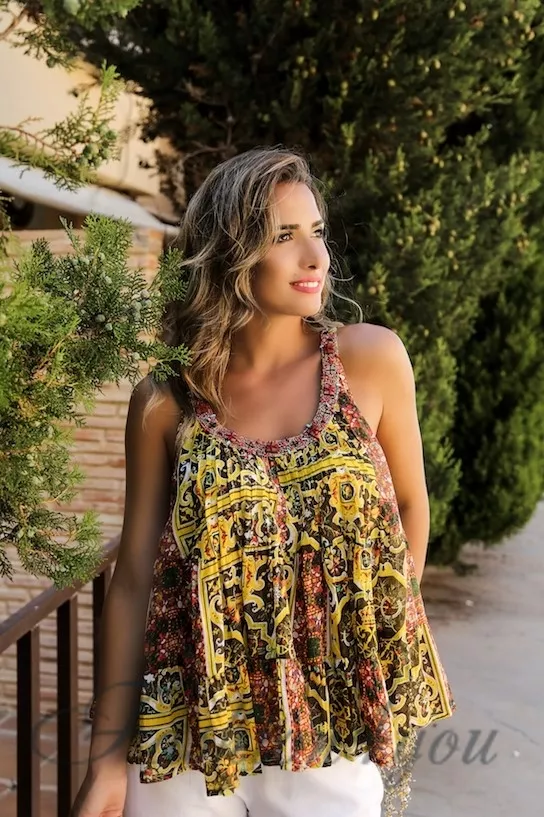 Майка топ из хлопка AnastaSea свободного кроя. Длина короткая, мини. Туника блузка нежнейшего желтого цвета, по изделию с машинной вышивкой цветочного орнамента белыми нитками. Эта простая изящная вещь украсит Вас по дороге на пляж или во время отдыха. Приятное дополнение к Вашему летнему гардеробу.