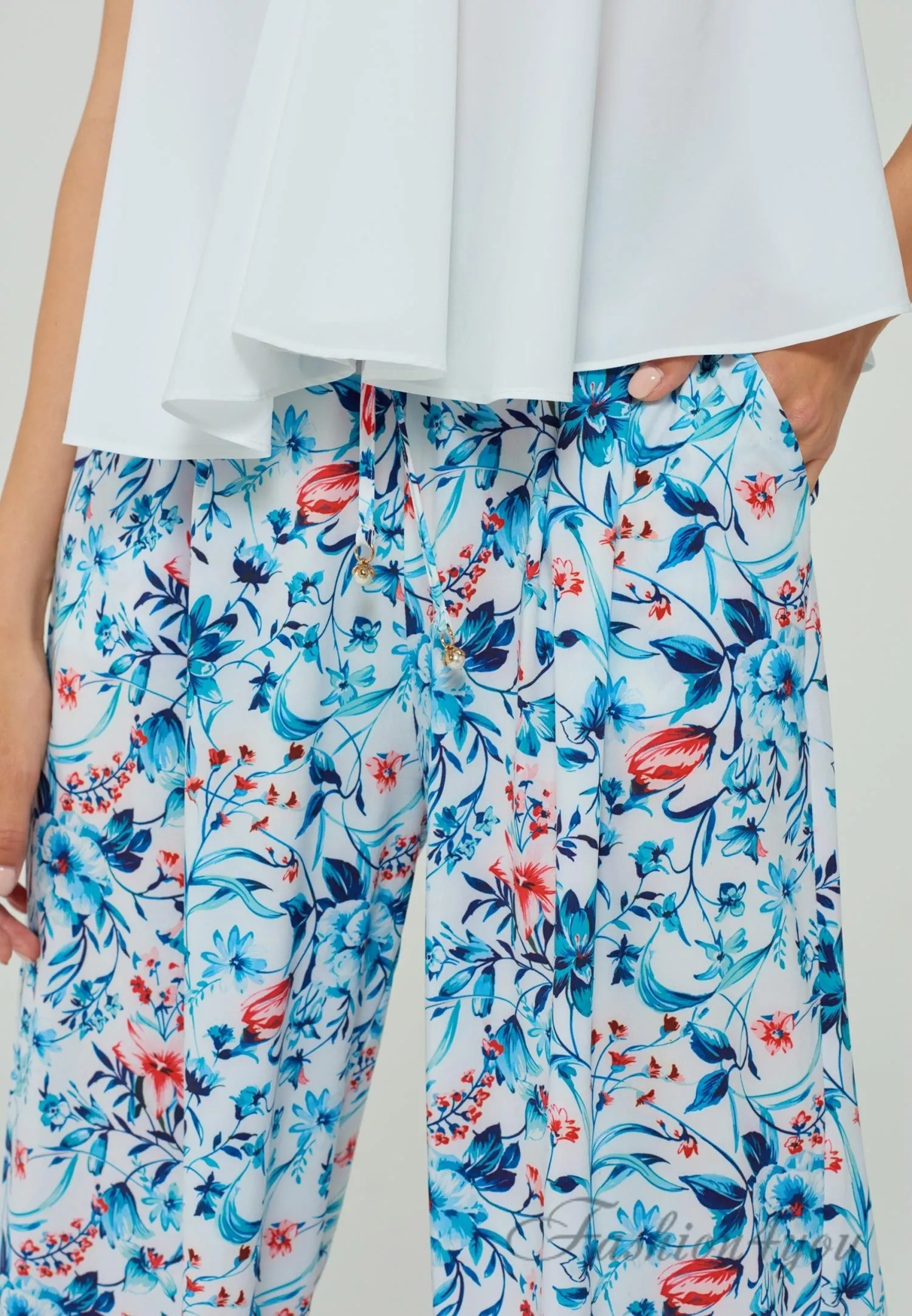 Длинные летние брюки со средней линией талии. Сзади есть эластичная резинка. Свободный крой. Боковые карманы. Пояс на шнурках.