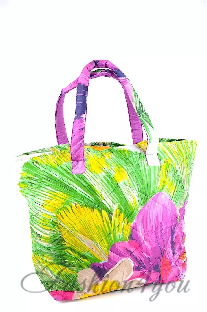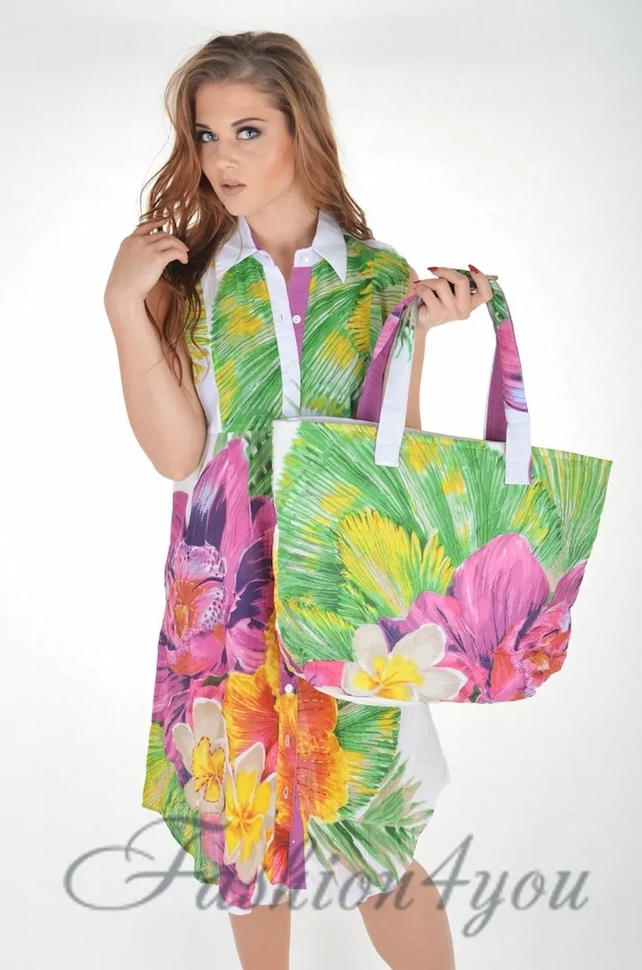 Великолепная и очень яркая пляжная сумка Iconique является неповторимым элементом коллекции Лето Итальянского производителя. Она имеет прямоугольную форму и украшена бесподобным рисунком в виде красочных больших тропических цветков. Сумка очень легка и практична из-за того, что сделана из 100% коттона на подкладке. Длинные ручки с внутренней стороны окрашены в фиолетовый цвет. По стилю сумка отлично сочетается с моделями туник KN-621 и KN-651.